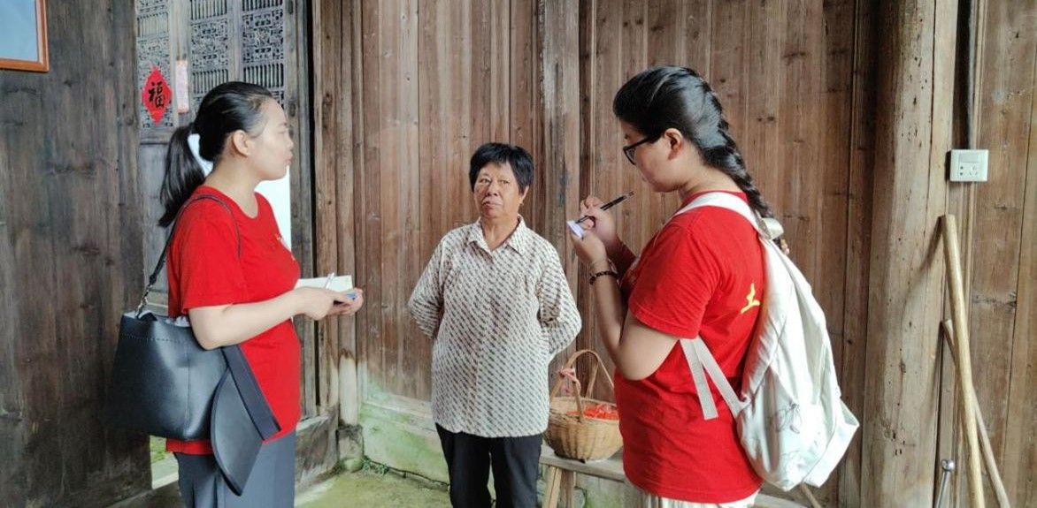 实践团成员们带着精心设计的问卷,穿梭于青石巷陌,叩开乡民家门,细致了解他们对古建价值的认知、日常修缮难题、政策了解程度以及对保护与开发的期待。在深入走访中,不同乡民的心声让实践团深切感受到古建筑保护的迫切与复杂。年过七旬的饶爷爷指着家中因不当修缮而霉变斑驳的墙面,痛心道:“特意找人修护,结果方法不对头。给门板刷了层油漆,看着亮堂,却把潮气闷在里面,导致木料发霉变形,把老物件的纹路质感都毁了!”随儿子回乡创业的王奶奶,对古镇也感情深厚,她忧心忡忡地指着院角松动的木雕:“看着这些宝贝快散架了真心疼,就盼着懂行的专家来好好修修,别让老物件在咱们手上断了传承。”无论是世代居住的原住民还是新乡民,都表达了对古建的珍视与忧虑。祝阿姨特意为实践团成员泡上当地茶,一句“把大家的想法带出去,让更多人关注石塘的老房子”的郑重托付,更让学子们深感肩上责任的沉甸甸。