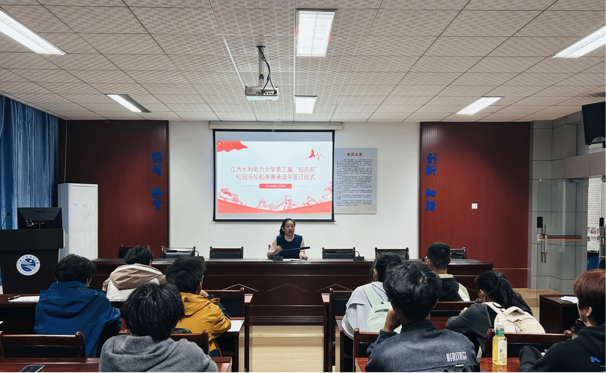 为强化赛事安全管理,统筹推进校园马拉松赛事准备工作,11月4日晚,土木与建筑工程学院团委在土建楼B207-1开展江西水利电力大学第三届“校庆杯”校园马拉松参赛承诺书签订仪式。土木与建筑工程学院团委书记万珊主持会议,全体参赛同学到场参会。
