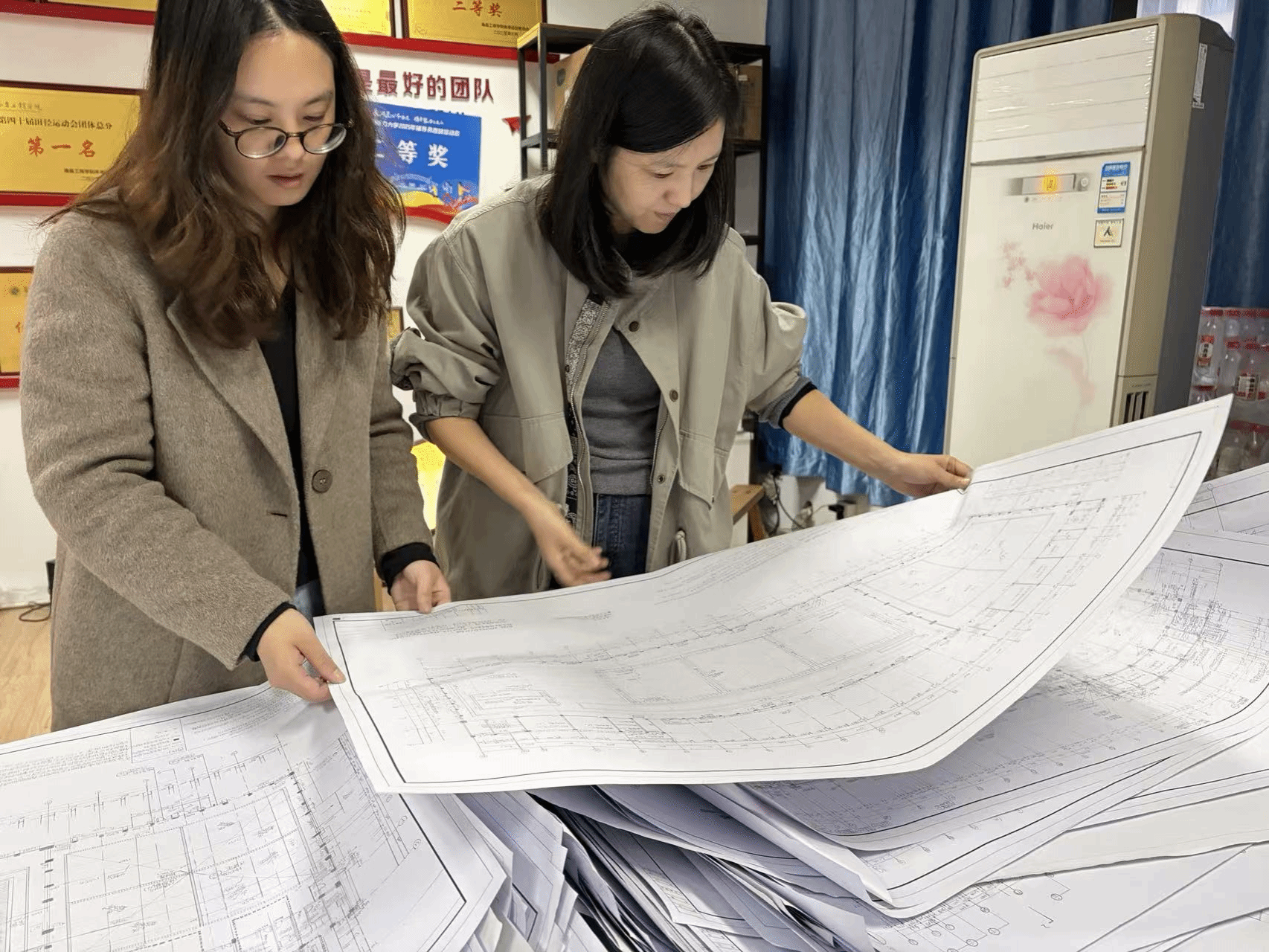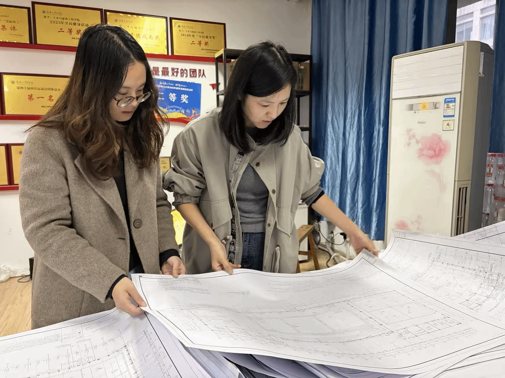 本次比赛共收到来自学院4个年级共465份参赛作品。评审专家委员会成员翁之韵、丁芸到场评图与指导。专家评委们从图纸规范、比例精度、线条表达、标注完整性等维度逐一细致审核,对图纸中的亮点给予肯定,对存在的问题逐一标注并耐心讲解。