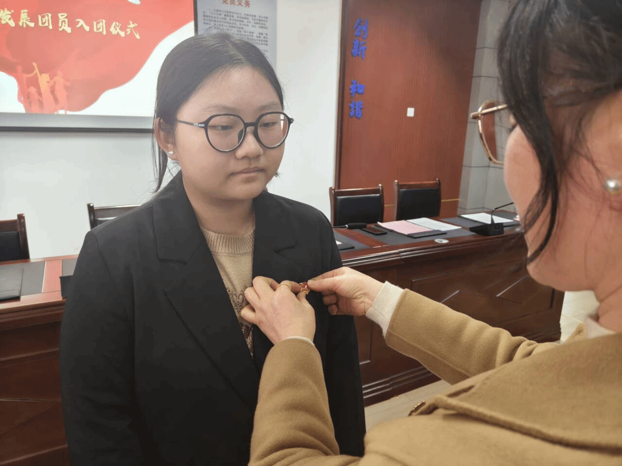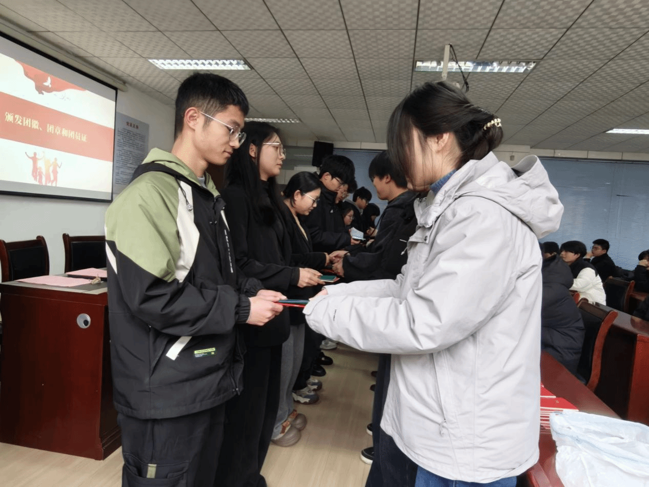 万珊宣读新发展团员名单后,与会嘉宾为新团员颁发团徽、团章和团员证。全体新团员面向团旗庄严宣誓。