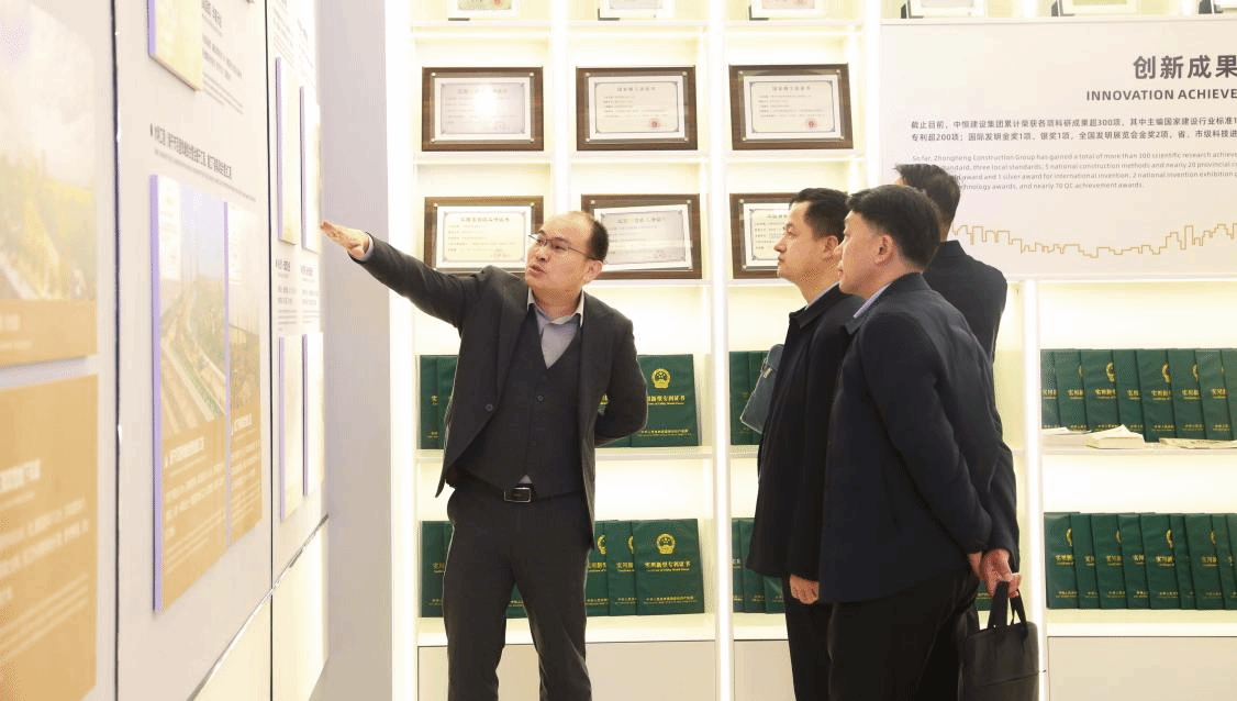谢彪一行参观了中恒建设集团展厅,深入了解集团的发展历程、科技成果、社会贡献与党建工作,以及长螺旋施工技术、中恒样式雷文化等优势领域。