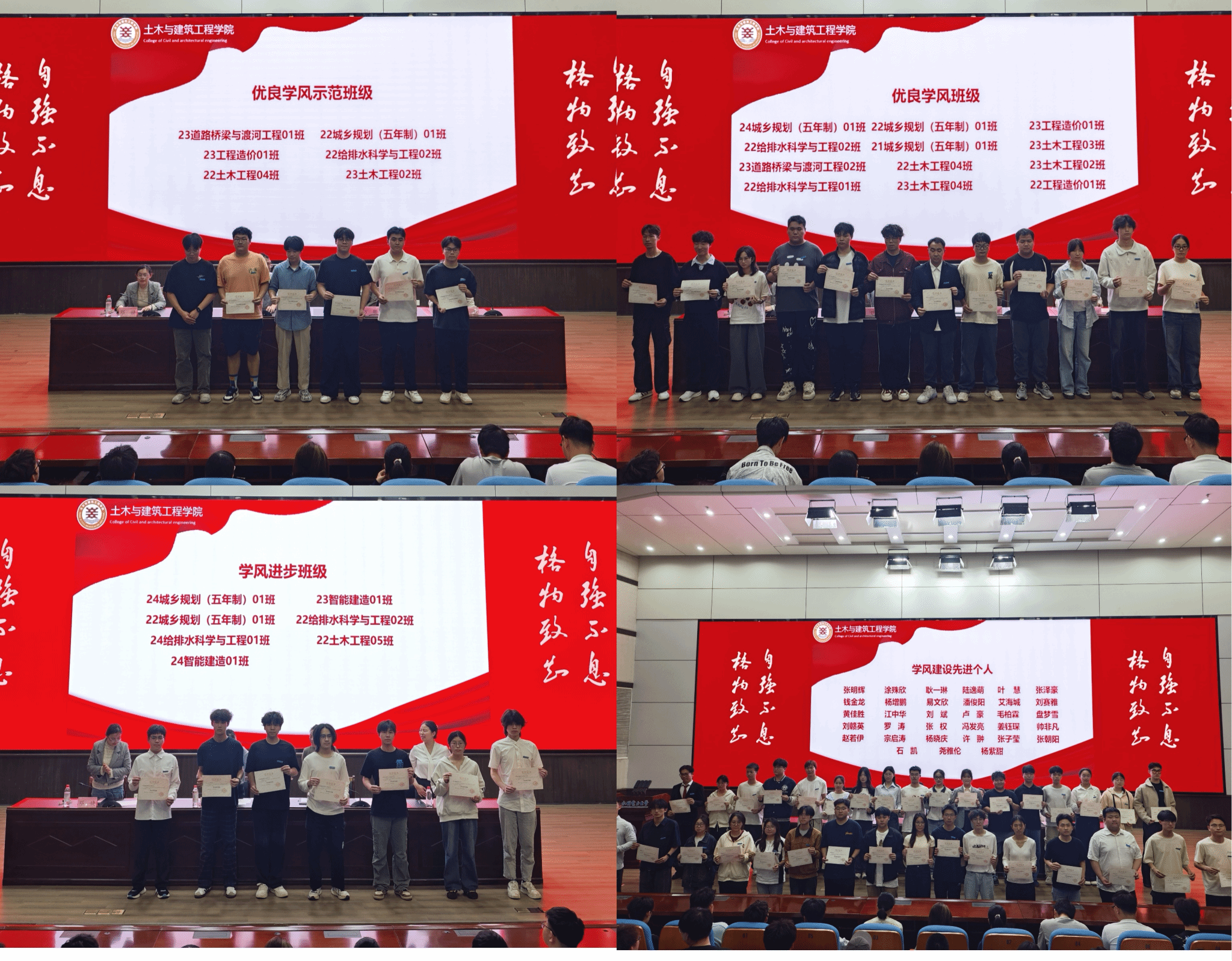 会上,李甘总结回顾了2025年学院学风建设工作成果,并对2026年学风建设内容、目标与具体实施方法进行了全面阐述,激励广大同学要明确学习目标,努力培养专业志趣,争做有为青年,并为获得2025年学风建设先进个人、学风进步班级、优良学风班级与优良学风示范班级荣誉的班级和个人进行集中颁奖。学院最美大学生代表2022级道路桥梁与渡河工程专业刘奇、优良学风示范班级代表2022级城乡规划(五年制)专业彭慧敏、优良学风班级代表2024级城乡规划(五年制)专业姜钰琛、学风进步班级代表2024级智能建造专业汪波和学风建设先进个人代表2024级道路桥梁与渡河工程专业刘赣英分别做经验交流。