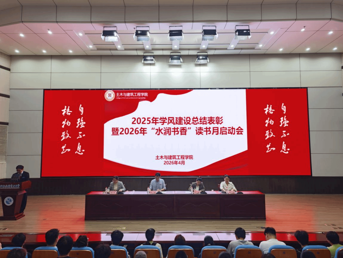 4月9日,土木与建筑工程学院在大禹学术报告厅开展2025年度学风建设总结表彰大会暨2026年“水润书香”读书月启动会,学院党委副书记李甘、全体辅导员,2021级-2024级学生代表和25级全体新生等400余人参加。