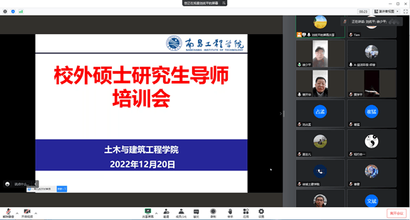 12月20日下午,土木与建筑工程学院校外研究生导师培训会以腾讯会议方式进行。土木与建筑工程学院院长、省级平台主任、学科与研究生培养秘书以及校内外研究生导师参加会议。