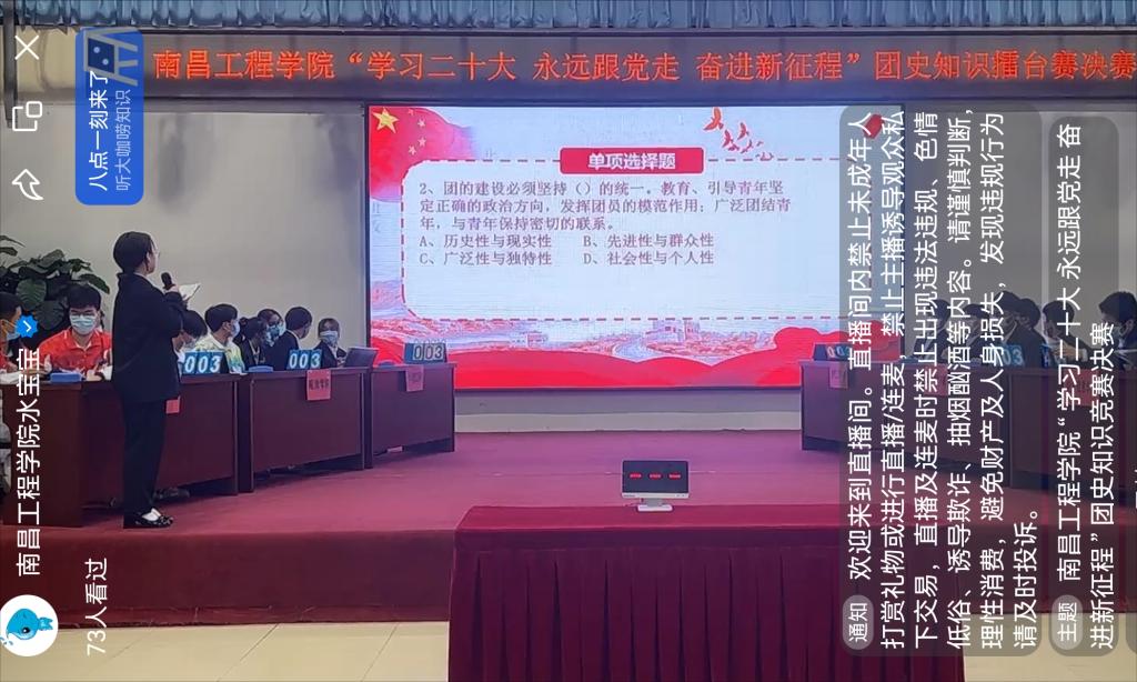 近日,由校团委主办、土木与建筑工程学院团委承办的“学习二十大 永远跟党走 奋进新征程”团史知识擂台赛圆满结束。其中,个人擂台赛采取线上比赛形式,14个学院共计12000余人次参与四期擂台赛活动。团体擂台赛分必答题、抢答题、风险题三个环节,通过个人赛晋级的6个学院代表队参加角逐。最终,经济贸易学院代表队荣获一等奖,研究生院代表队荣获二等奖,电气工程学院代表队和瑶湖学院代表队荣获三等奖,土木与建筑工程学院代表队和理学院代表队荣获优秀奖。(文/赵天源 图/徐伟)