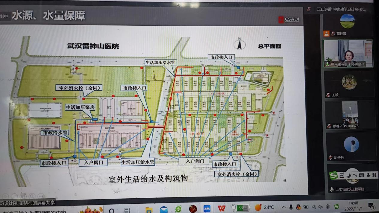 11月1日下午,中南建筑设计院第一机电院给排水总工程师秦晓梅做客我校第242期“鄱湖学术讲坛”,通过腾讯会议方式作题为《雷神山医院给排水设计总结与反思》的报告。土木与建筑工程学院师生近200人参加活动。
