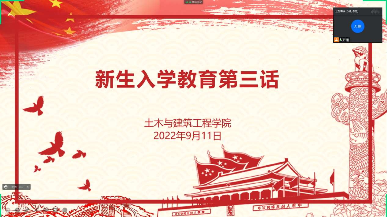 9月11日下午,土木与建筑工程学院团委书记万珊为新生开展“社团与学生干部”的主题宣讲。万老师首先祝贺新生顺利加入南昌工程学院,加入到土木与建筑工程学院这个大家庭中。随后,万老师根据新生的特点和需求,线上带领同学们参观了榫卯辅导员工作室、榫卯青年服务站,详细介绍了学院社团与学生干部分工、土木与建筑工程学院近年所获荣誉,希望同学们以此为榜样,迎头赶上。