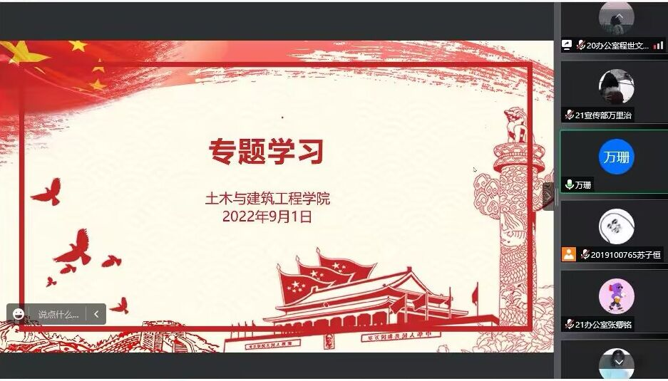 为更加高效有序地开展新学期团委学生会工作,深入学习习近平总书记重要讲话精神,土木与建筑工程学院于9月1日晚在线上召开新学期第一次团委学生会工作例会。