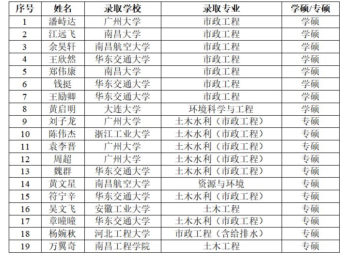 星光不问赶路人,时光不负有心人。近日,全国高校2022年硕士研究生招生考试成绩陆续公布,土木与建筑工程学院2018级给排水科学与工程01班佳音频传,取得了令人骄傲的考研佳绩。班级共有37位学生,录取研究生19名,占比占比51.35%。其中学硕录取8名、专硕录取11名,两位同学录取“211”高校。