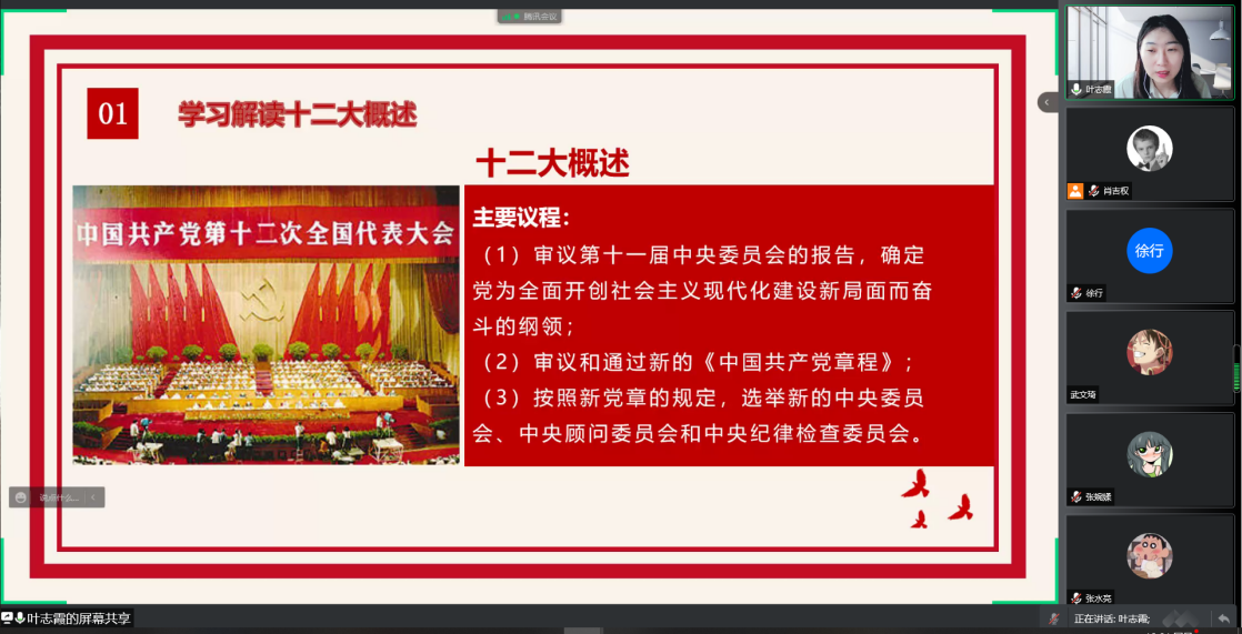 随后,党员叶志霞从大会的背景、内容、意义及启示等方面,为团支部带来了专题团课分享。叶志霞表示:“中国共产党第十二次全国代表大会的胜利召开,标志着党成功地实现了具有重大历史性意义的伟大转变。它开始把中国带入建设有中国特色的社会主义的新的政治轨道,并以全面开创社会主义现代化建设的新局面而永远载入史册。”