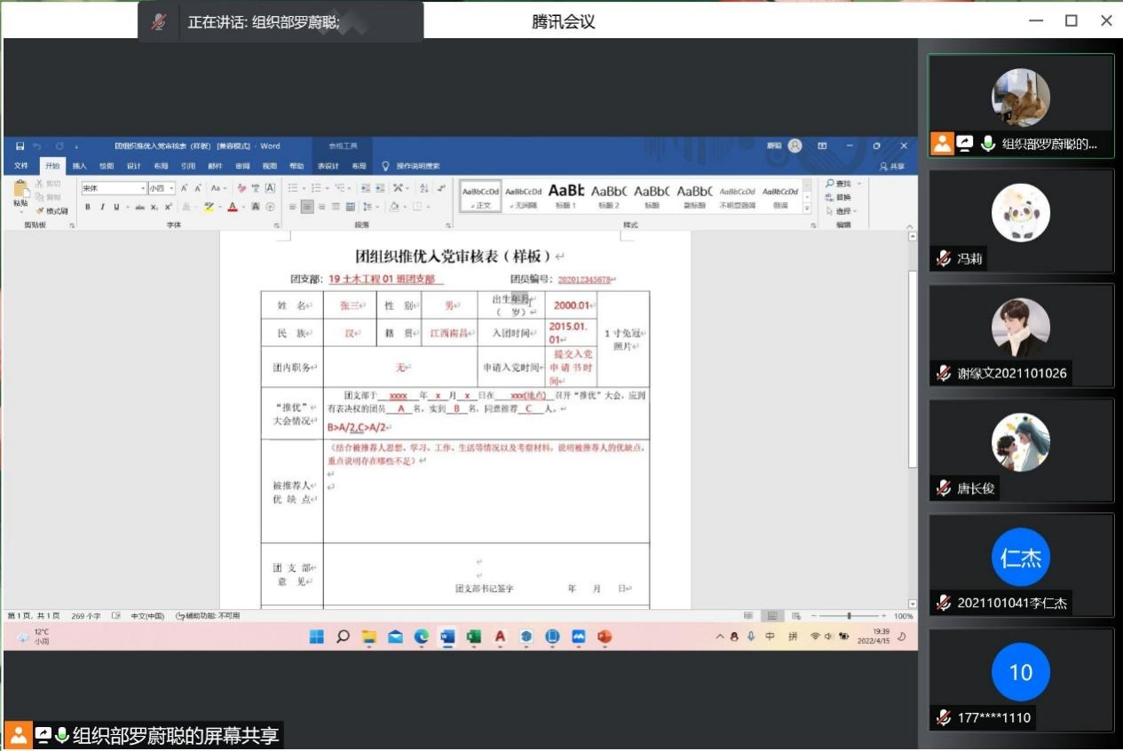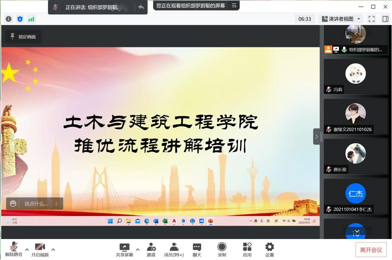 4月15日,土木与建筑工程学院团委开展线上推优工作专题培训会,学院团委组织部负责人罗蔚聪主持,已递交入党申请书的2020级、21级近200名共青团员参加培训会,学院分团委副书记万珊出席会议。