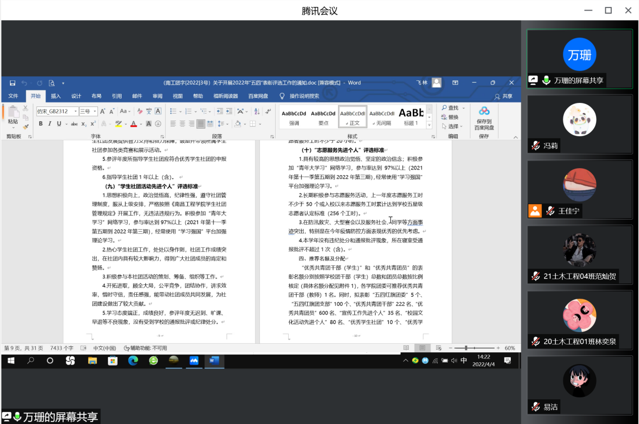 为进一步表彰团员先进典型,维护校园安全稳定,4月4日,土木与建筑工程学院召开线上会议。学院辅导员黄萍、各团支部书记、主要学生干部参会,分团委副书记万珊主持会议。
