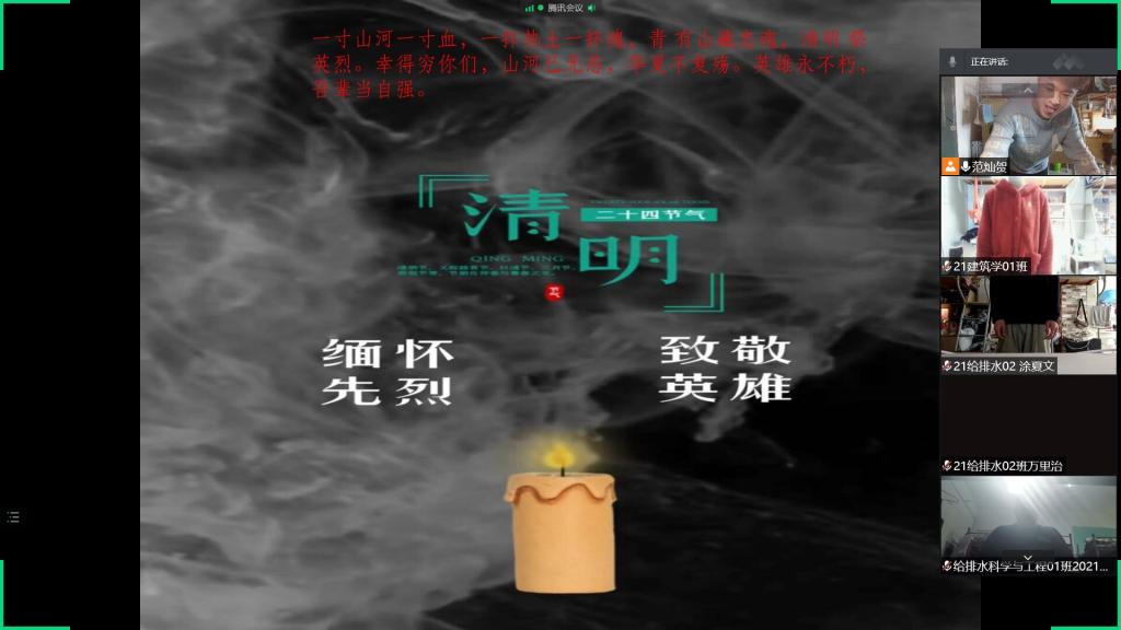 清明至,祭先祖;缅怀意,深情诉。进入四月以来,为巩固疫情防控工作、广泛宣传文明祭扫活动,营造安全、有序的祭扫氛围,4月5日,土木与建筑工程学院青马工程培训班组织开展清明节线上祭扫活动。