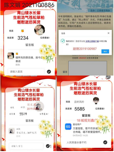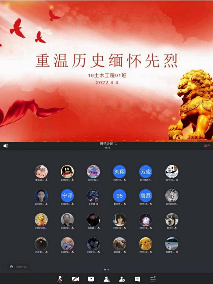 各班级团支部利用线上会议的方式,深切悼念为中国革命事业前仆后继、英勇献身的革命先烈,缅怀他们的革命精神和无私奉献的高尚情怀。同时通过“中华英烈网”等相关平台向英雄先烈们抒写自己的感言寄语。部分团支部邀请团员代表讲述“一名革命先烈”的英雄事迹,传承红色基因,赓续精神血脉,汲取奋进力量。
