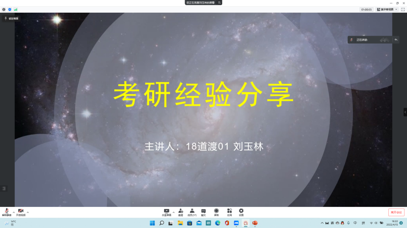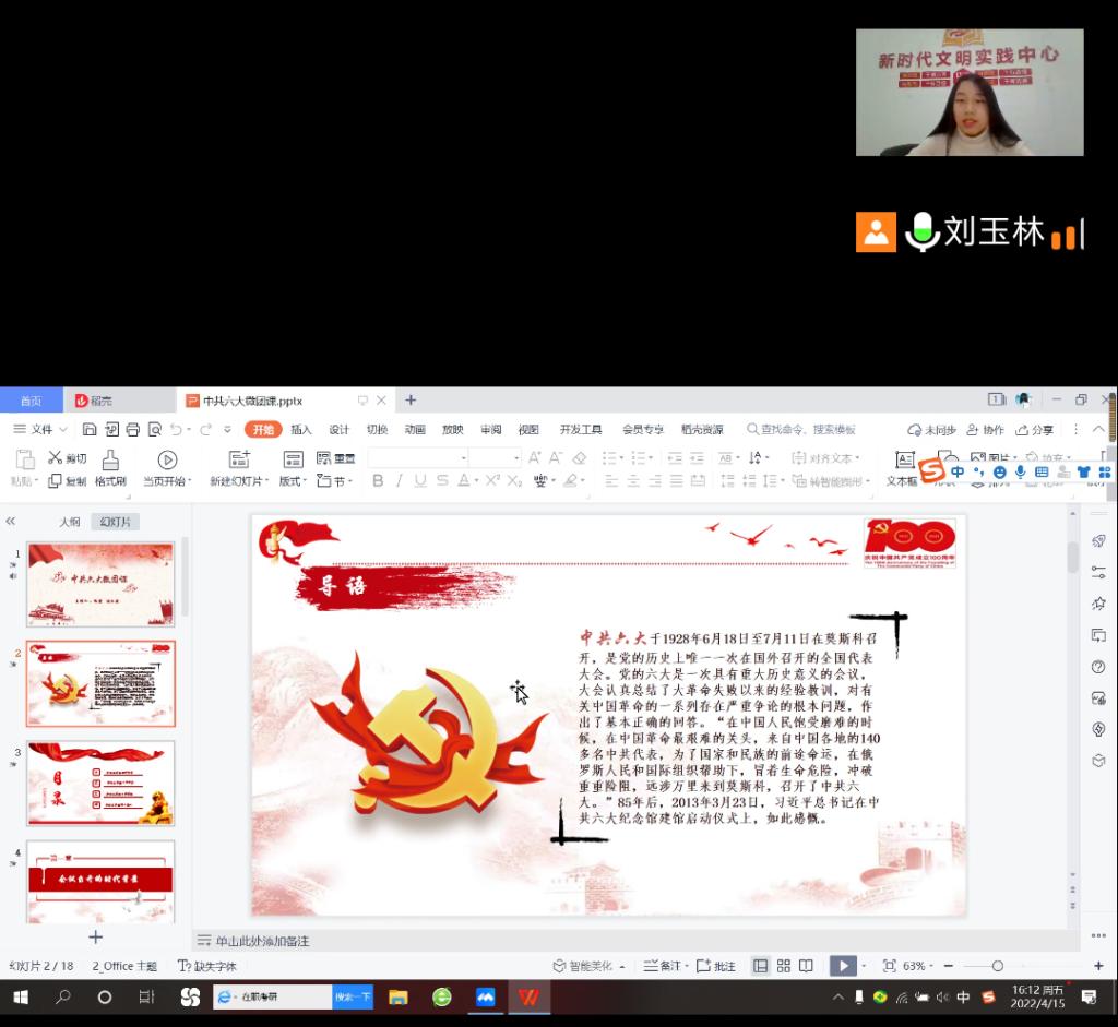 活动在庄严的宣誓中拉开帷幕。会上,陈露以中国共产党第六次全国代表大会和共青团第六次全国代表大会相关历史为主线,围绕召开背景、会议精神、历史意义等方面,向团员们做专题团课分享。刘玉林结合自身考研实际,与线上团员讲述自己备考历程、择校经历、复试经验、科研之路。鼓励大家要志存高远,早日做好学业、就业规划。
