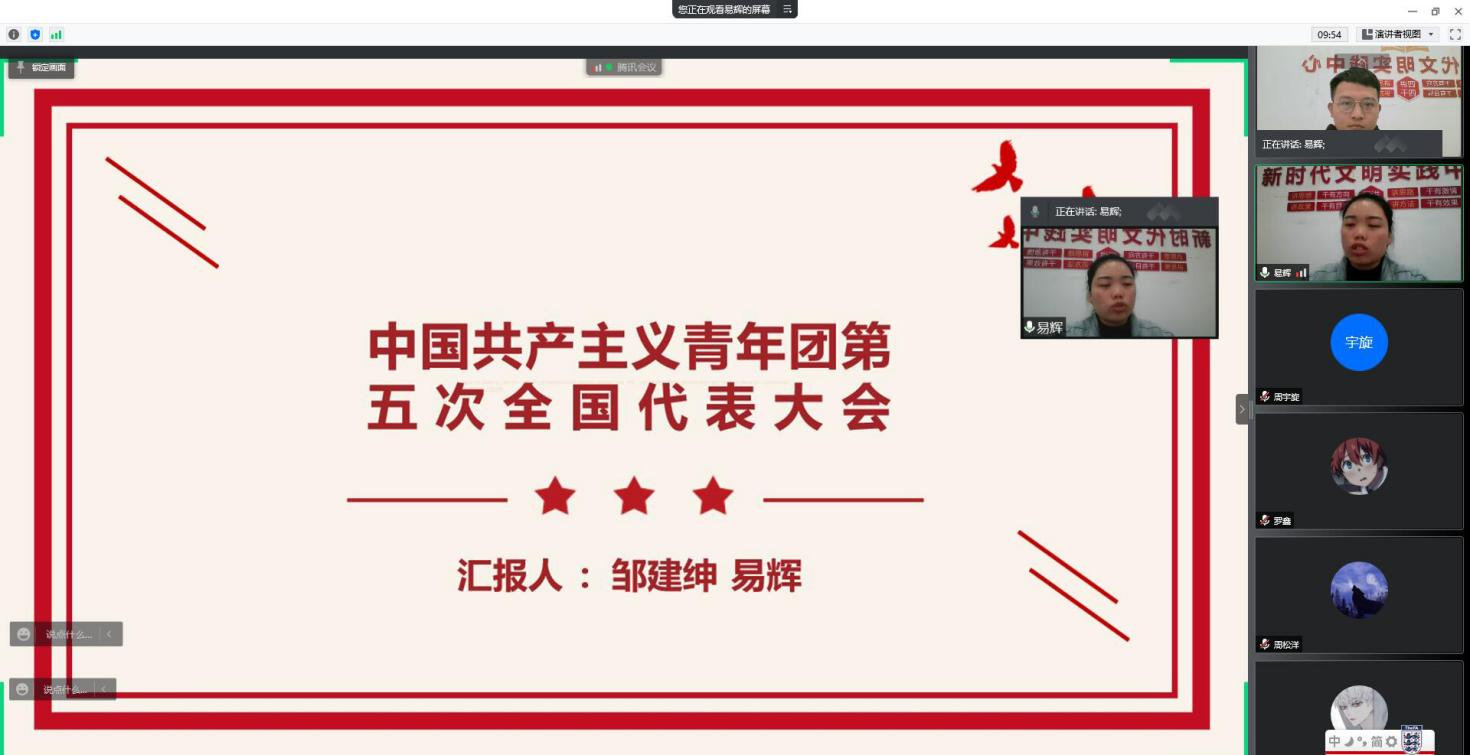 活动中,邹建绅、易辉在学八栋新时代文明实践中心向线上的团员青年分享了中国共产主义青年团第五次全国代表大会相关历史。他们结合中国共产党第六次全国代表大会精神,详细讲述了团五大制定的工作方针和任务,通过的7项决议案以及新的《团章》。