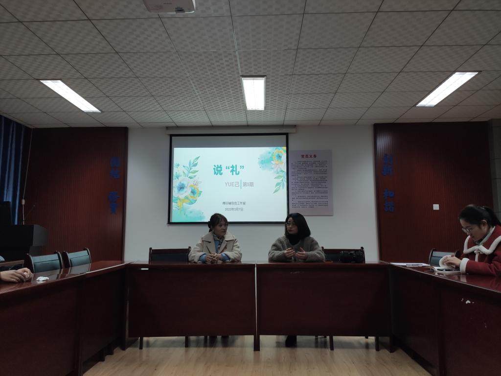 3月7日,榫卯辅导员工作室“YUE己”沙龙第5期在土建楼B207-1举行,此次沙龙邀请外国语学院肖芬老师做嘉宾,工作室负责人万旎主持。