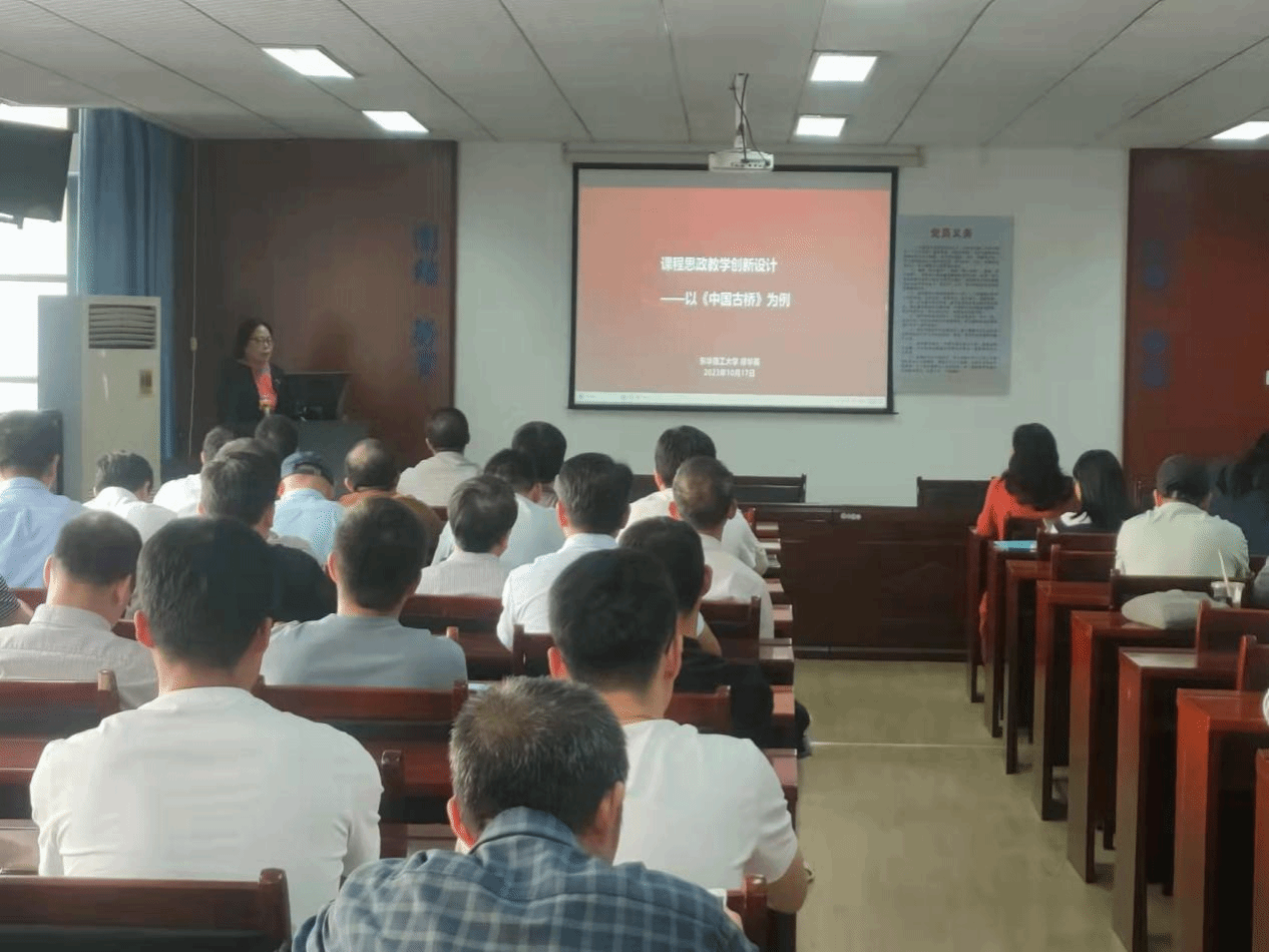 为了提高教师课程思政设计水平和专业教学能力,10月17日下午东华理工大学课程思政教学研究中心主任、教育部课程思政教学名师、江西省首届金牌教授廖华英教授应邀为我院全体教师作了题为“课程思政教学创新案例设计—以《中国古桥》为例”的课程思政教学专题讲座并参加教师座谈会,曾开华副主任主持活动。
