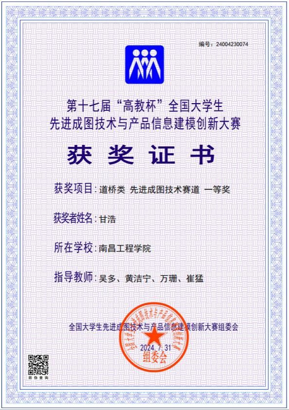 近日,第十七届“高教杯”全国大学生先进成图技术与产品信息建模创新大赛全国总决赛在贵州大学(主赛场)以及南昌航空大学(江西省分赛场)成功落下帷幕。本届大赛由来自全国的895所高校、12694名选手参加。我校土木与建筑工程学院教师首次组织学生参加比赛,获得桥梁数字化创新设计赛道一等奖1项、二等奖1项,先进成图技术赛道一等奖1项、二等奖1项、三等奖1项,并荣获道桥类团体二等奖。