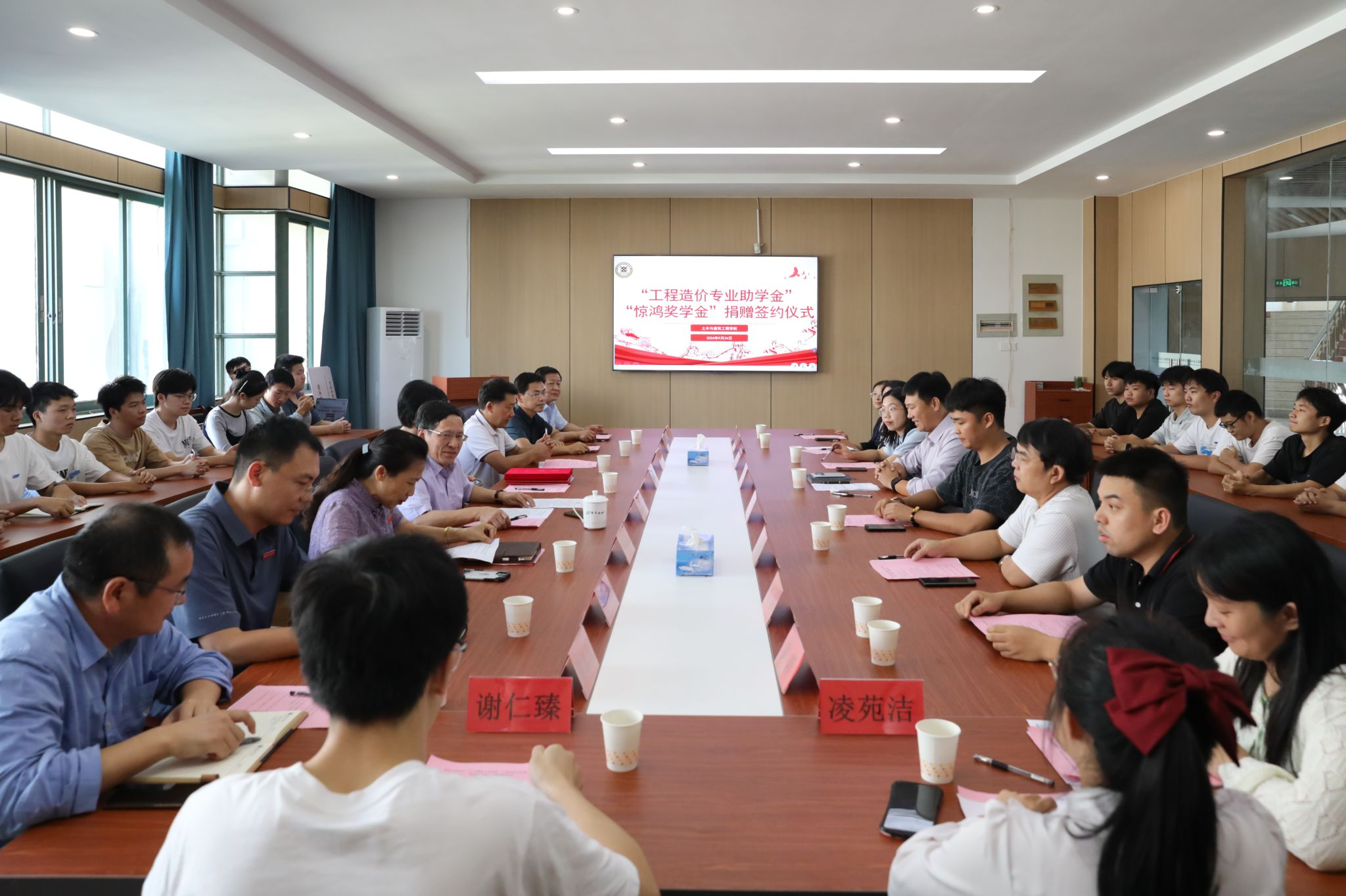 9月24日,土木与建筑工程学院“工程造价专业助学金”、“惊鸿奖学金”捐赠签约仪式在土建楼 B313 会议室隆重举行,南昌工程学院党委书记汪胜前、江西省南昌工程学院教育发展基金会副理事长兼秘书长田红敏、2001级工程造价专业校友崔剑、周睿迪、2018级道路桥梁与渡河工程校友罗林、土木与建筑工程学院党政领导班子成员及师生代表共40余人参加仪式。