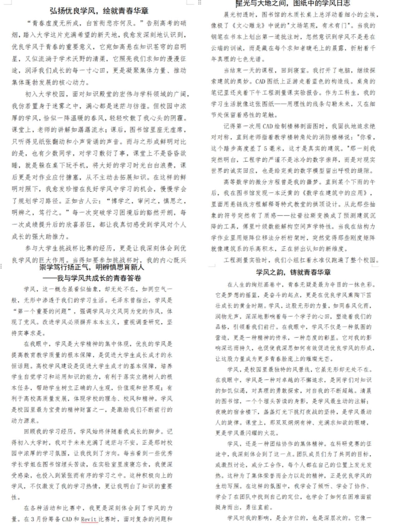 本次“弘扬优良学风,展现青春风貌”学风建设主题征文活动,不仅为同学们提供了一个展示自我和提升能力的平台,更通过征文的形式,增强同学们的阅读意识和写作能力。活动期间,同学们各抒己见,结合个人学习经历、科研竞赛、社会实践等,紧扣征文主题“我眼中的学风”“学风对我的影响”等内容,阐述了学风建设对个人成长和集体发展的重要作用。