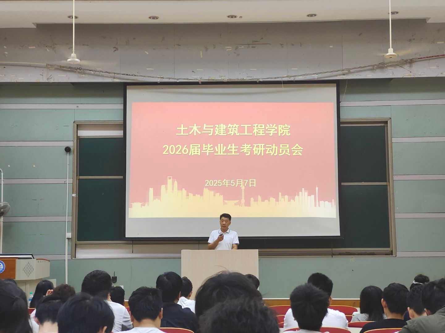 为助力2026届毕业生明确考研目标,掌握备考方法,5月7日,土木与建筑工程学院在北C104召开2026届毕业生考研动员会。学院院长徐斌、党委副书记李甘、2025届优秀学长学姐以及2026届毕业生共同参加了此次动员会。