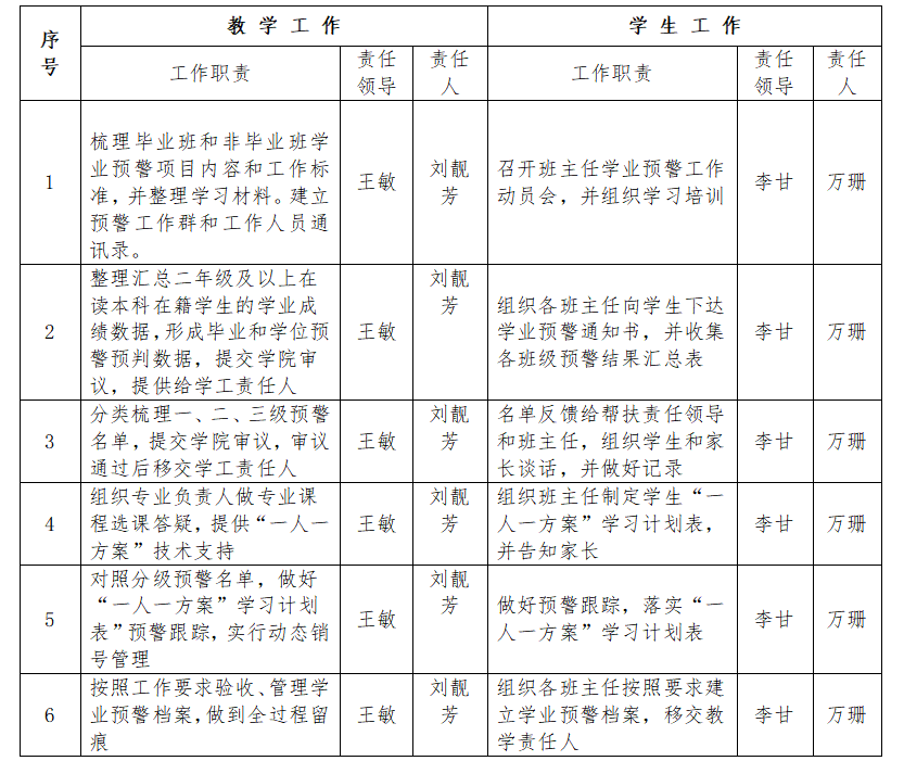 学业预警组织工作主要包括教学片和学生片工作,分别由分管教学和学生工作的领导牵头组织实施。要求各项工作做到明确分工,责任到人,确保教学和学工联动,高质量完成学业预警工作。