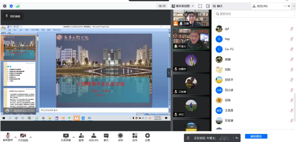 4月5日下午,土木与建筑工程学院邀请水利与生态工程学院牛景太副院长就工程教育认证申报工作进行线上辅导报告。报告会由副院长王敏主持,学院相关领导、各教研室主任、专业负责人、教务人员和全体教师参会。