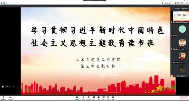 54日,土木与建筑工程学院第三学生党支部开展学习贯彻习近平新时代中国特色社会主义思想主题教育培训班集中学习研讨,支部书记万珊主持会议,支部全体党员线上参会。